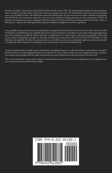 Darkness and Light is a book of story collections Dr. Kőrösi Gabriella wrote in 2021. The stories include inspirational stories, motivation, stories focusing on self-improvement. Many of the stories have personal experiences. You will find nature and travel stories, food-related stories, and a handful of recipes. You will find fun stories from Gabriella and a few fun stories that were told by Gabriella's mom Borbala. You will find the writer's perspective under the writer's eye section. Health and Healing-related stories from exploring the COVID -19 pandemic to looking at stress, anxiety, and genetics. The final section in the book is about human suffering, death, and mortality. I hope you will enjoy this collection that will bring both the exploration of darkness and light into your life in a good way. "I was gratefully a beta reader for her current book Darkness and Light. In this book, Dr. Kőrösi shares stories from 2021 while the COVID 19 Pandemic was still affecting our lives globally. She shares her personal experiences and addresses many creative and practical applications that can be included in everyday life. I believe that there is something for every shrewd reader in this book.I was gratefully a beta reader for her current book Darkness and Light. In this book, Dr. Kőrösi shares stories from 2021 while the COVID 19 Pandemic was still affecting our lives globally. She shares her personal experiences and addresses many creative and practical applications that can be included in everyday life. I believe that there is something for every shrewd reader in this book." Dr Mehmet Yildz "Lady Dr. Gabriella Korosi is a prolific writer. I had the chance of reading her book on A Collection Of Stories called Darkness and Light. I found that it was a very interesting book divided into several parts. In it were words of wisdom, fun stories, inspirational stories, and stories that required a deep thought about life, health, and ultimately the reality of death that one day each one has to leave the earth. This is a book required for everyday usage. It helps you to think about various issues of life. It is very comprehensive. A very valuable resource as it covers many issues about life." Dr. Preeti Singh
