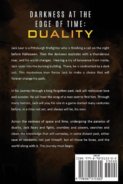 Jack Lear is a Pittsburgh firefighter who is finishing a call on the night before Halloween. Then the darkness explodes with a thunderous roar, and his world changes. Hearing a cry of innocence from inside, Jack races into the burning building. There, he is confronted by a dark suit. This mysterious man forces Jack to make a choice that will forever change his path. In his journey through a long-forgotten past, Jack will rediscover love and wonder. He will hear the song of a man sent to find him. Through many horrors, Jack will play his role in a game started many centuries before, in a time not yet, and always will be, his own. Across the vastness of space and time, undergoing the paradox of duality, Jack faces and fights, crumbles and cowers, searches and steals the knowledge that will someday, in some distant past, either save or condemn, not just himself, but all those he loves, and the world along with it. The journey must begin.