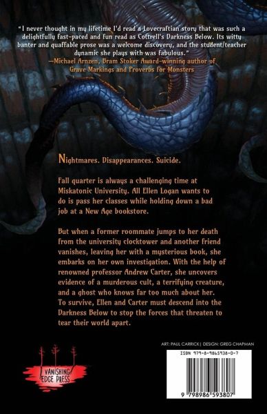 Nightmares, disappearances, & suicide. Fall semester is always a challenging time at Miskatonic University. All Ellen Logan wants to do is pass her classes while holding down a bad job at a New Age bookstore. But when a former roommate jumps to her death from the university clocktower and another friend vanishes, leaving her with a mysterious book, she embarks on her own investigation. With the help of renowned professor Andrew Carter, she uncovers evidence of a murderous cult, a terrifying creature, and a ghost who knows far too much about her. To survive, Ellen and Carter must descend into the Darkness Below to stop the forces that threaten to tear their world apart. "Fans of Kij Johnson's The Dream-Quest of Vellitt Boe and Victor LaValle's The Ballad of Black Tom will enjoy this eldritch adventure." -Ross E. Lockhart, editor of The Book of Cthulhu and Cthulhu Fhtagn! Awards for Darkness Below: 2023 The Book Fest First Place in Paranormal Urban Fantasy & Gothic Horror 2024 Indie Reader Best First Book 2023 Readers' Favorite Silver Medal Winner in Horror Fiction Will Ellen defeat the unspeakable evil forces threatening Miskatonic? Click the BUY NOW button to follow her into the Darkness Below.