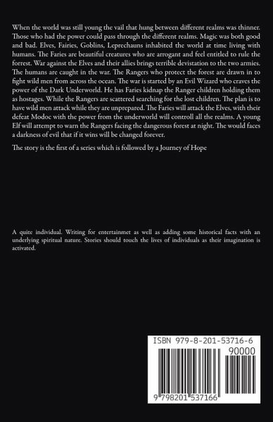 When the world was still young the vail that hung between different realms was thinner. Those who had the power could pass through the different realms. Magic was both good and bad. Elves, Fairies, Goblins, Leprechauns inhabited the world at time living with humans. The Faries are beautiful creatures who are arrogant and feel entitled to rule the forrest. War against the Elves and their allies brings terrible devistation to the two armies. The humans are caught in the war. The Rangers who protect the forest are drawn in to fight wild men from across the ocean. The war is started by an Evil Wizard who craves the power of the Dark Underworld. He has Faries kidnap the Ranger children holding them as hostages. While the Rangers are scattered searching for the lost children. The plan is to have wild men attack while they are unprepared. The Faries will attack the Elves, with their defeat Modoc with the power from the underworld will controll all the realms. A young Elf will attempt to warn the Rangers facing the dangerous forest at night. The would faces a darkness of evil that if it wins will be changed forever. The story is the first of a series which is followed by a Journey of Hope