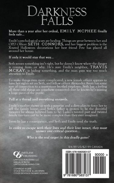 More than a year after her ordeal, Emily McPhee finally feels safe... Emily's psychological scars are healing. Things are great between her and OPD Officer Seth Connors, and her biggest problem is the X-rated Halloween decorations her best friend Pete has placed all around her house. If only it would stay that way... Seth senses something isn't right, but he doesn't know where the danger is coming from...or why. He's sure Emily's neighbor, Travis McKay, is hiding something, and the man pays way too much attention to Emily. To make things even more complicated, a new female officer appears to have her sights set on Seth, and fellow officer Alexander Avery has some sort of connection to a mysterious brothel employee. Seth has a feeling all these odd things are somehow connected-but he knows he's missing a huge piece of the puzzle. Pull at a thread and everything unravels. Emily's mother shows up with a surprise and a dirty plan to force her to sell the family home...and Seth's father is proven to be the deceitful monster he always believed him to be. Lasko's tainted past and twisted family ties turn out to be more complex than they ever imagined. Every lie has a consequence, and Seth and Emily need the truth. In order to escape with their lives and their love intact, they must answer one critical question... Who is the real target in this deadly game?