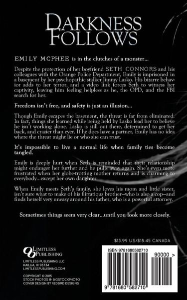 Emily McPhee is in the clutches of a monster... Despite the protection of her boyfriend Seth Connors and his colleagues with the Orange Police Department, Emily is imprisoned in a basement by her psychopathic stalker Jimmy Lasko. His bizarre behavior adds to her terror, and a video link forces Seth to witness her captivity, leaving him feeling helpless as he, the OPD, and the FBI search for her. Freedom isn't free, and safety is just an illusion... Though Emily escapes the basement, the threat is far from eliminated. In fact, things she learned while being held by Lasko lead her to believe he isn't working alone. Lasko is still out there, determined to get her back, and crazier than ever. If he does have a partner, Emily has no idea where the threat might lie or who she can trust. It's impossible to live a normal life when family ties become tangled. Emily is deeply hurt when Seth is reminded that their relationship might endanger her further and he pulls away again. She's even more frustrated when her globe-trotting mother returns and is charming to everybody...except her own daughter. When Emily meets Seth's family, she loves his mom and little sister, isn't sure what to make of his flirtatious brother-who is also a cop-and finds herself very uneasy around his father, who is a powerful attorney. Sometimes things seem very clear...until you look more closely.
