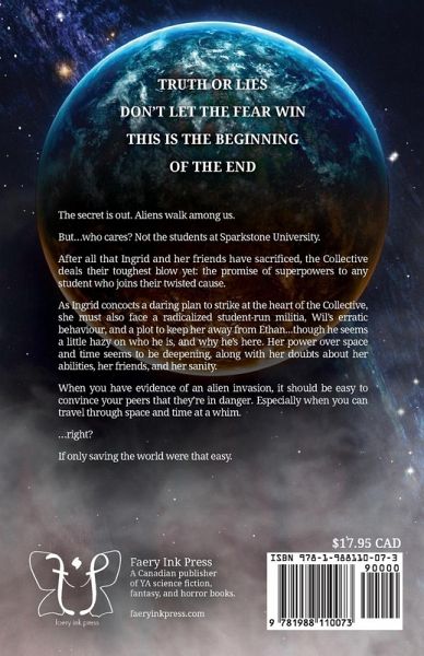 The secret is out. Aliens walk among us. But...who cares? Not the students at Sparkstone University. After all that Ingrid and her friends have sacrificed, the Collective deals their toughest blow yet: the promise of superpowers to any student who joins their twisted cause. As Ingrid concocts a daring plan to strike at the heart of the Collective, she must also face a radicalized student-run militia, Wil's erratic behaviour, and a plot to keep her away from Ethan...though he seems a little hazy on who he is, and why he's here. Her power over space and time seems to be deepening, along with her doubts about her abilities, her friends, and her sanity. When you have evidence of an alien invasion, it should be easy to convince your peers that they're in danger. Especially when you can travel through space and time at a whim. ...right? If only saving the world were that easy.