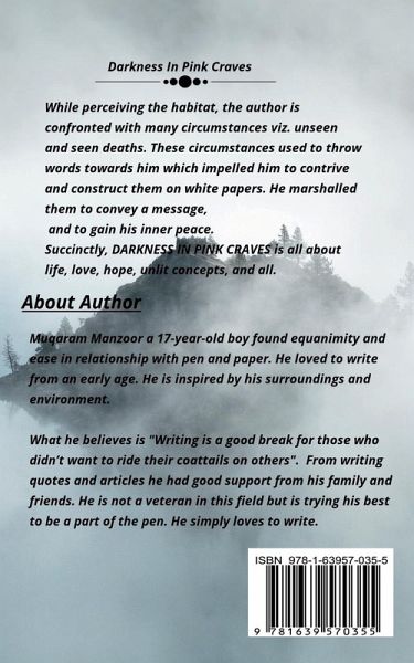 While perceiving the habitat, the author is confronted with many circumstances viz. unseen and seen deaths. These circumstances used to throw words towards him which impelled him to contrive and construct them on white papers. He marshalled them to convey a message, and to gain his inner peace. Succinctly, DARKNESS IN PINK CRAVES is all about life, love, hope, unlit concepts, and all.