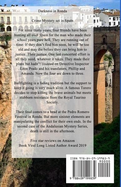 Andalucía, Spain. An enchanting setting for a crime mystery series. Ronda is the birthplace of modern-day bullfighting and home to one of Spain's oldest bullrings. Magnificent beasts are brutally slaughtered there under the searing heat of the afternoon sun, as they have been for centuries. Inevitably, the popularity of this national tradition is dying. The future looks bleak for those that earn their living from it. Yet there is hope. In this second book of the Andalusian Mystery Series, Diego Romero, a heroic torero, recognizes the need for change. The killing must stop. All he has to do is persuade bullfighting's controlling body, to accept his reforming proposals. They listen but refuse to do anything. Less savory foreigners are also concerned that regular contests should continue as normal. They too cannot afford for Diego to win the day and are not prepared to sit by and do nothing. The battle comes to a head at La Goyesca, Ronda's stylish bullfighting festival right under the noses of Detective Inspector Leon Prado and his translators Amanda Salisbury and Phillip Armitage.