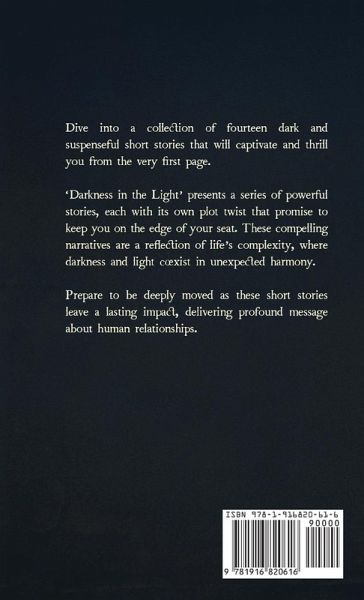 Step into a realm where shadows dance within the brilliance of human emotion. 'Darkness in the Light' unveils a collection of fourteen captivating short stories that explore the intricacies of love, drama, and the tapestry of life itself. From tender moments to unexpected twists that tug at heartstrings, each tale explores the depths of human emotion, from the rawness of love to the complexities of family ties. In this mosaic of narratives, sadness takes centre stage, weaving its bittersweet thread through every page. These stories are a reflection of life's complexity, where light and darkness coexist in unexpected harmony. Journey through the pages as characters fighting with their own demons, both literal and metaphorical. Each story is a mirror reflecting the myriad facets of the human experience - the beauty and the anguish, the joy and the despair. With 'Darkness in the Light,' immerse yourself in the poignant narratives that remind us of our shared humanity. Unlock the door to a world where emotions flow freely, and let the stories resonate within, long after the final page. This is a collection that delves deep into the human psyche, embracing the darkness that resides within us all, and finding the glimmers of hope that illuminate our path forward. Order of the stories: 1 A Demon's Destiny 2 The Wedding Day 3 The Best Friends 4 The Test 5 The Flatmate 6 The Passengers 7 The Choices 8 The Perfect Family 9 The Store 10 The Father's Love 11 Sam 12 She and Them 13 The Stranger 14 The Riddle