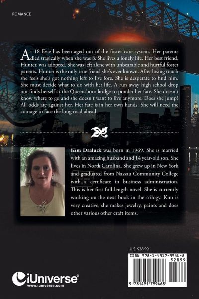 At 18 Evie has been aged out of the foster care system. Her parents died tragically when she was 8. She lives a lonely life. Her best friend, Hunter, was adopted. She was left alone with unbearable and hurtful foster parents. Hunter is the only true friend she's ever known. After losing touch she feels she's got nothing left to live fore. She is desperate to find him. She must decide what to do with her life. A run away high school drop out finds herself at the Queensboro bridge to ponder her fate. She doesn't know where to go and she doesn't want to live anymore. Does she jump? All odds are against her. Her fate is in her own hands. She will need the courage to face the long road ahead.