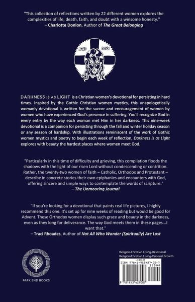 Darkness is as Light is a Christian women's devotional for persisting in hard places. Inspired by the Gothic Christian women mystics, this unapologetically womanly devotional is written for the succor and encouragement of women going through hard times, by women who have experienced God's presence in suffering. You'll recognize God in every entry by the way each woman met Him in her darkness. This nine-week devotional is a perfect length for persisting through the fall and winter holiday season or any season of hardship. In Darkness is as Light, twenty-two women authors-Orthodox, Catholic, and saint-venerating Protestant-bear witness without pulling their punches, without tidying away their womanhood, their vulnerability, their bravery, or their womb-deep understanding of how God fills all things and redeems suffering with joy-if one can wait. This timely volume taps into the timelessness of Gothic women's faith that was richly reliant upon God and expected God to be with women in suffering. These modern Gothic devotions reach out to the untamed woman, the lost woman, the too-much woman, the woman who loves and hurts, the woman who grieves and hopes, who desires and disciplines herself to receive God. The Gothic faith shared in clear, crisp narrative reflections in these pages can reach the woman who doesn't have her life together or a quip to summarize her love; God's presence is enough of a moral to her story. ¿¿With illustrations reminiscent of the work of Gothic women mystics and poetry to begin each week of reflection, Darkness is as Light explores with beauty the hardest places where women meet God.