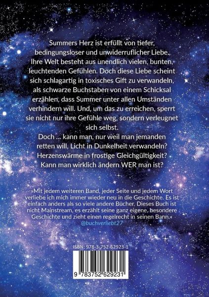 Summers Herz ist erfüllt von tiefer, bedingungsloser und unwiderruflicher Liebe. Ihre Welt besteht aus unendlich vielen, bunten, leuchtenden Gefühlen.Doch diese Liebe scheint sich schlagartig in toxisches Gift zu verwandeln, als schwarze Buchstaben von einem Schicksal erzählen, dass Summer unter allen Umständen verhindern will. Und, um das zu erreichen, sperrt sie nicht nur ihre Gefühle weg, sondern verleugnet sich selbst.Doch... kann man, nur weil man jemanden retten will, Licht in Dunkelheit verwandeln? Herzenswärme in frostige Gleichgültigkeit?Kann man wirklich ändern WER man ist?