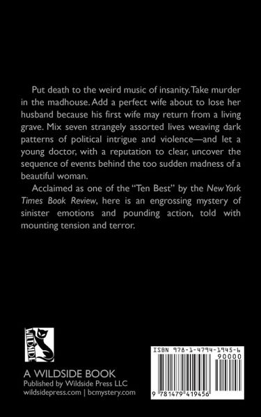 Put death to the weird music of insanity. Take murder in the madhouse. Add a perfect wife about to lose her husband because his first wife may return from a living grave. Mix seven strangely assorted lives weaving dark patterns of political intrigue and violence -- and let a young doctor, with a reputation to clear, uncover the sequence of events behind the too sudden madness of a beautiful woman. Acclaimed as one of the "Ten Best" by the New York Times Book Review, here is an engrossing mystery of sinister emotions and pounding action, told with mounting tension and terror.