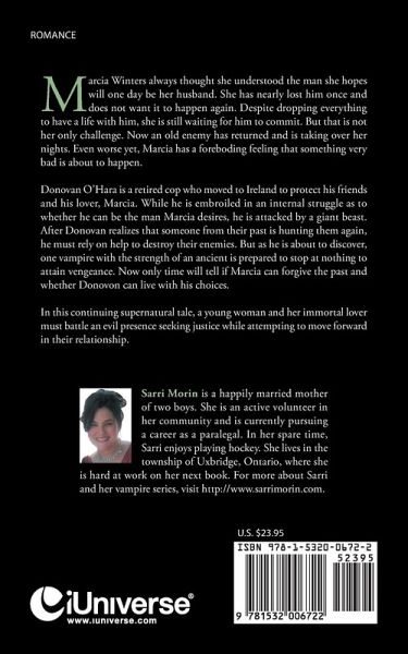 Marcia Winters always thought she understood the man she hopes will one day be her husband. She has nearly lost him once and does not want it to happen again. Despite dropping everything to have a life with him, she is still waiting for him to commit. But that is not her only challenge. Now an old enemy has returned and is taking over her nights. Even worse yet, Marcia has a foreboding feeling that something very bad is about to happen. Donovan O'Hara is a retired cop who moved to Ireland to protect his friends and his lover, Marcia. While he is embroiled in an internal struggle as to whether he can be the man Marcia desires, he is attacked by a giant beast. After Donovan realizes that someone from their past is hunting them again, he must rely on help to destroy their enemies. But as he is about to discover, one vampire with the strength of an ancient is prepared to stop at nothing to attain vengeance. Now only time will tell if Marcia can forgive the past and whether Donovon can live with his choices. In this continuing supernatural tale, a young woman and her immortal lover must battle an evil presence seeking justice while attempting to move forward in their relationship.