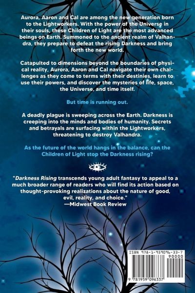 Aurora, Aaron and Cal are among the new generation born to the Lightworkers. With the power of the Universe in their souls, these Children of Light are the most advanced beings on Earth. Summoned to the ancient realm of Valhandra, they prepare to defeat the rising Darkness and bring forth the new world. Catapulted to dimensions beyond the boundaries of physical reality, Aurora, Aaron and Cal navigate their own challenges as they come to terms with their destinies, learn to use their powers, and discover the mysteries of life, space, the Universe, and time itself. But time is running out. A deadly plague is sweeping across the Earth. Darkness is creeping into the minds and bodies of humanity. Secrets and betrayals are surfacing within the Lightworkers, threatening to destroy Valhandra. As the future of the world hangs in the balance, can the Children of Light stop the Darkness rising?