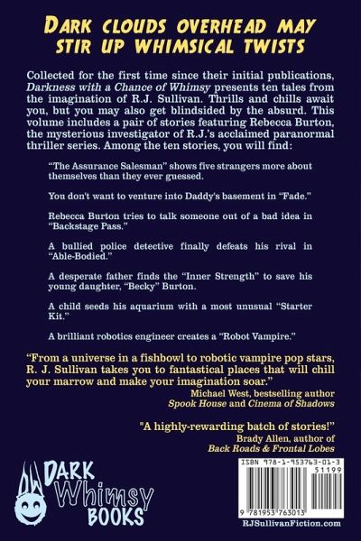 Dark clouds overhead may stir up whimsical twists. Collected for the first time since their initial publications, Darkness with a Chance of Whimsy presents ten tales from the imagination of R.J. Sullivan. Thrills and chills await you, but you may also get blindsided by the absurd. This volume includes a pair of stories featuring Rebecca Burton, the mysterious investigator of R.J.'s acclaimed paranormal thriller series. Among the ten stories, you'll find: "The Assurance Salesman" shows five strangers more about themselves than they ever guessed. You don't want to venture into Daddy's basement in "Fade." Rebecca Burton tries to talk someone out of a bad idea in "Backstage Pass." A bullied police detective finally defeats his rival in "Able-Bodied." A desperate father finds the "Inner Strength" to save his young daughter, "Becky" Burton. A child seeds his aquarium with a most unusual "Starter Kit." A brilliant robotics engineer creates a "Robot Vampire."