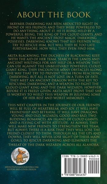 Skrymir Darkwing has been abducted right in front of his friends and they were powerless to do anything about it. He is being held by a powerful being, the King of the Cloud Giants, and he wants the ancient Frost magic Darkwing possesses. Darkwing knows that his friends will try to rescue him, but will they be too late. Furthermore, how will they even find him? Akita Blackwing, the Duchess of Blackwing Keep, with the aid of her team, search the lands and ancient tomes for any help or a weapon they can use against the unbelievably powerful Cloud Giant King. They encounter many obstacles along the way that try to prevent them from reaching Darkwing, but all is not lost. In a turn of fate, they meet an ancient Dragon with the key to rescuing Darkwing and a weapon to fight the Cloud Giant King and the Dark Wizards. However, before it is freely given, Akita must prove that she is worthy to wield this weapon by reliving some of her best and worst memories.