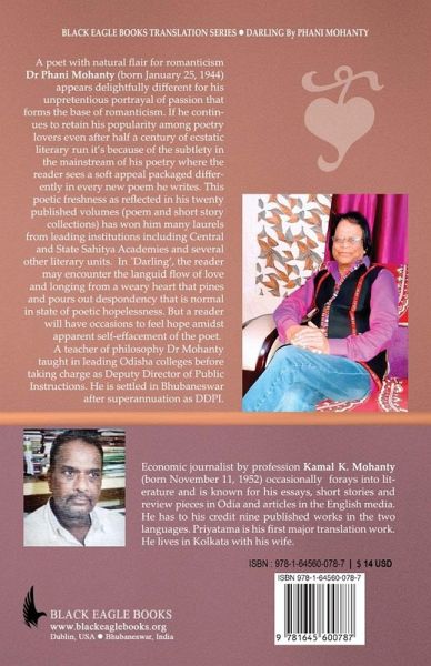 "DARLING" is the English translation of eminent Odia poet Phani Mohanty's much acclaimed long poem "Priyatama". It's translator K.K. Mohanty says, "While translating Priyatama I fell in love with an imaginary woman. It is a strange experience. Love has been defined by many romantic souls but the one definition I rejoice is from Shakespeare. ''Love is merely a madness and...deserves as well a dark house and a whip as madmen do.'' I am sure the poet has been inflicted by liberal doses of madness and his mention of dark house may suggest that he did suffer for his poetic pursuit. I did plunge in a splendid isolation even while enjoying every word he wrote about his Priyatama."