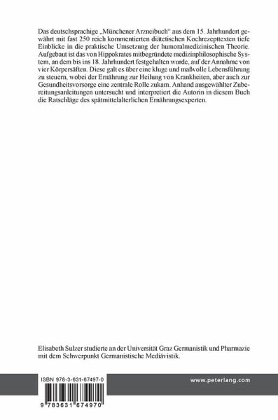 Das deutschsprachige "Münchener Arzneibuch" aus dem 15. Jahrhundert gewährt mit fast 250 reich kommentierten diätetischen Kochrezepttexten tiefe Einblicke in die praktische Umsetzung der humoralmedizinischen Theorie. Aufgebaut ist das von Hippokrates mitbegründete medizinphilosophische System, an dem bis ins 18. Jahrhundert festgehalten wurde, auf der Annahme von vier Körpersäften. Diese galt es über eine kluge und maßvolle Lebensführung zu steuern, wobei der Ernährung zur Heilung von Krankheiten, aber auch zur Gesundheitsvorsorge eine zentrale Rolle zukam. Anhand ausgewählter Zubereitungsanleitungen untersucht und interpretiert die Autorin in diesem Buch die Ratschläge des spätmittelalterlichen Ernährungsexperten.