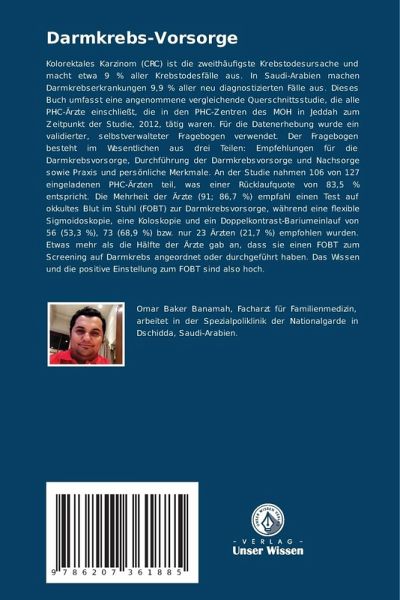 Kolorektales Karzinom (CRC) ist die zweithäufigste Krebstodesursache und macht etwa 9 % aller Krebstodesfälle aus. In Saudi-Arabien machen Darmkrebserkrankungen 9,9 % aller neu diagnostizierten Fälle aus. Dieses Buch umfasst eine angenommene vergleichende Querschnittsstudie, die alle PHC-Ärzte einschließt, die in den PHC-Zentren des MOH in Jeddah zum Zeitpunkt der Studie, 2012, tätig waren. Für die Datenerhebung wurde ein validierter, selbstverwalteter Fragebogen verwendet. Der Fragebogen besteht im Wesentlichen aus drei Teilen: Empfehlungen für die Darmkrebsvorsorge, Durchführung der Darmkrebsvorsorge und Nachsorge sowie Praxis und persönliche Merkmale. An der Studie nahmen 106 von 127 eingeladenen PHC-Ärzten teil, was einer Rücklaufquote von 83,5 % entspricht. Die Mehrheit der Ärzte (91; 86,7 %) empfahl einen Test auf okkultes Blut im Stuhl (FOBT) zur Darmkrebsvorsorge, während eine flexible Sigmoidoskopie, eine Koloskopie und ein Doppelkontrast-Bariumeinlauf von 56 (53,3 %), 73 (68,9 %) bzw. nur 23 Ärzten (21,7 %) empfohlen wurden. Etwas mehr als die Hälfte der Ärzte gab an, dass sie einen FOBT zum Screening auf Darmkrebs angeordnet oder durchgeführt haben. Das Wissen und die positive Einstellung zum FOBT sind also hoch.
