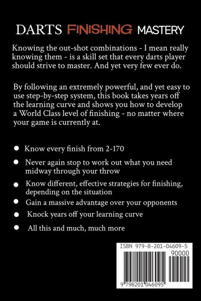 Easily and effortlessly master every finish from 2 to 170... Knowing the out-shot combinations – I mean really knowing them – is a skill set that every darts player should strive to master. And yet very few ever do. By following an extremely powerful, and yet easy to use step-by step system, this book takes years off the learning curve and shows you how to develop a World Class level of finishing – no matter where you are currently at. Darts Finishing Mastery: How to Master the Art of Finishing is a university level course in the art of finishing. Once learned, you will instinctively know every finish from 2-170 along with many different options to get them. Don't let finishing get in your way ever again – Learn these methods NOW...