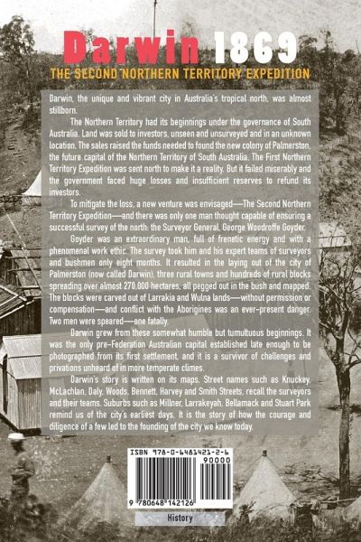 Darwin, the unique and vibrant city in Australia's tropical north, was almost stillborn. The Northern Territory had its beginnings under the governance of South Australia. Land was sold to investors, unseen and unsurveyed and in an unknown location. The sales raised the funds needed to found the new colony of Palmerston, the future capital of the Northern Territory of South Australia. The First Northern Territory Expedition was sent north to make it a reality. But it failed miserably and the government faced huge losses and insufficient reserves to refund its investors. To mitigate the loss, a new venture was envisaged - The Second Northern Territory Expedition - and there was only one man thought capable of ensuring a successful survey of the north: the Surveyor General, George Woodroffe Goyder. Goyder was an extraordinary man, full of frenetic energy and with a phenomenal work ethic. The survey took him and his expert teams of surveyors and bushmen only eight months. It resulted in the laying out of the city of Palmerston (now called Darwin), three rural towns and hundreds of rural blocks spreading over almost 270,000 hectares, all pegged out in the bush and mapped. The blocks were carved out of Larrakia and Wulna lands - without permission or compensation - and conflict with the Aborigines was an ever-present danger. Two men were speared - one fatally. Darwin grew from these somewhat humble but tumultuous beginnings. It was the only pre-Federation Australian capital established late enough to be photographed from its first settlement, and it is a survivor of challenges and privations unheard of in more temperate climes. Darwin's story is written on its maps. Street names such as Knuckey, McLachlan, Daly, Woods, Bennett, Harvey and Smith Streets, recall the surveyors and their teams. Suburbs such as Millner, Larrakeyah, Bellamack and Stuart Park remind us of the city's earliest days. It is the story of how the courage and diligence of a few led to the founding of the city we know today.