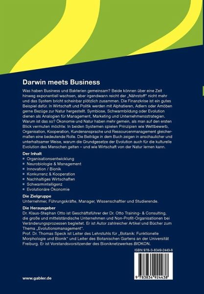 Ökonomie und Natur haben mehr gemein, als man auf den ersten Blick vermuten möchte: In beiden Systemen spielen Prinzipien wie Wettbewerb, Organisation, Kooperation, Kundenansprache und Ressourcenmanagement gleichermaßen eine bedeutende Rolle. Die Beiträge in dem Buch zeigen in anschaulicher und unterhaltsamer Weise, warum die Grundgesetze der Evolution auch für die kulturelle Evolution des Menschen gelten - und wie Wirtschaft von der Natur lernen kann.