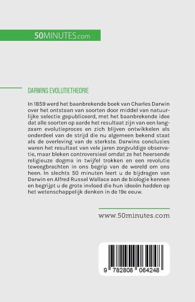 In 1859 werd het baanbrekende boek van Charles Darwin over het ontstaan van soorten door middel van natuurlijke selectie gepubliceerd, met het baanbrekende idee dat alle soorten op aarde het resultaat zijn van een langzaam evolutieproces en zich blijven ontwikkelen als onderdeel van de strijd die nu algemeen bekend staat als de overleving van de sterkste. Darwins conclusies waren het resultaat van vele jaren zorgvuldige observatie, maar bleken controversieel omdat ze het heersende religieuze dogma in twijfel trokken en een revolutie teweegbrachten in ons begrip van de wereld om ons heen. In slechts 50 minuten leert u de bijdragen van Darwin en Alfred Russel Wallace aan de biologie kennen en begrijpt u de grote invloed die hun ideeën hadden op het wetenschappelijk denken in de 19e eeuw. Dit eenvoudige en informatieve boek geeft een grondige bespreking van de ideeën in On the Origin of Species en de waarnemingen waarop ze gebaseerd zijn. Het bevat ook biografieën van Darwin en Wallace, een waardevolle inleiding tot de politieke, sociale en economische context en een evaluatie van de impact van de evolutietheorie, waardoor u alle essentiële informatie krijgt over de ontwikkeling van het Darwinisme. Over Darwins evolutietheorie : De evolutietheorie stelt dat de soorten niet onveranderlijk zijn, zoals het creationisme impliceert, maar dat zij het resultaat zijn van een langzaam evolutieproces vanuit een gemeenschappelijke voorouder. Darwin deed de waarnemingen die de basis legden voor zijn theorie van natuurlijke selectie tijdens zijn reis aan boord van de Beagle, en werkte de volgende 20 jaar voortdurend aan de verfijning ervan voordat hij zijn revolutionaire boek publiceerde.