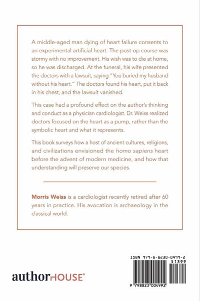 A middle-aged man dying of heart failure consents to an experimental artificial heart. The post-op course was stormy with no improvement. His wish was to die at home, so he was discharged. At the funeral, his wife presented the doctors with a lawsuit, saying "You buried my husband without his heart." The doctors found his heart, put it back in his chest, and the lawsuit vanished. This case had a profound effect on the author's thinking and conduct as a physician cardiologist. Dr. Weiss realized doctors focused on the heart as a pump, rather than the symbolic heart and what it represents. This book surveys how a host of ancient cultures, religions, and civilizations envisioned the homo sapiens heart before the advent of modern medicine, and how that understanding will preserve our species.
