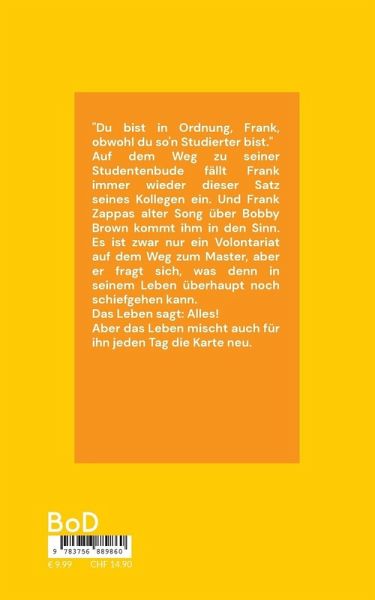 "Du bist in Ordnung, Frank, obwohl du so'n Studierter bist." Auf dem Weg zu seiner Studentenbude fällt Frank immer wieder dieser Satz seines Kollegen ein. Und Frank Zappas alter Song über Bobby Brown kommt ihm in den Sinn. Es ist zwar nur ein Volontariat auf dem Weg zum Master, aber er fragt sich, was denn in seinem Leben überhaupt noch schiefgehen kann. Das Leben sagt: Alles! Aber das Leben mischt auch für ihn jeden Tag die Karten neu.