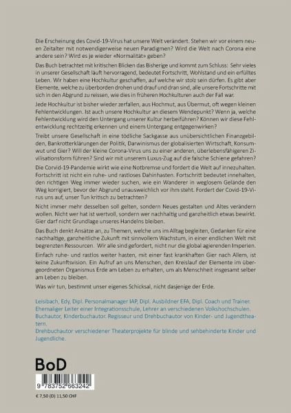 Die Erscheinung des Covid-19-Virus hat unsere Welt verändert. Stehen wir vor einem neuen Zeitalter mit notwendigerweise neuen Paradigmen? Wird die Welt nach Corona eine andere sein? Wird es je wieder «Normalität» geben? Das Buch betrachtet mit kritischen Blicken das Bisherige und kommt zum Schluss: Sehr vieles in unserer Gesellschaft läuft hervorragend, bedeutet Fortschritt, Wohlstand und ein erfülltes Leben. Wir haben eine Hochkultur geschaffen, auf welche wir stolz sein dürfen. Es gibt aber Elemente, welche zu überborden drohen und drauf und dran sind, alle unsere Fortschritte mit sich in den Abgrund zu reissen, wie dies in früheren Hochkulturen auch der Fall war. Jede Hochkultur ist bisher wieder zerfallen, aus Hochmut, aus Übermut, oft wegen kleinen Fehlentwicklungen. Ist auch unsere Hochkultur an diesem Wendepunkt? Wenn ja, welche Fehlentwicklung wird den Untergang unserer Kultur herbeiführen? Können wir diese Fehlentwicklung rechtzeitig erkennen und einem Untergang entgegenwirken? Treibt unsere Gesellschaft in eine tödliche Sackgasse aus unübersichtlichen Finanzgebilden, Bankrotterklärungen der Politik, Darwinismus der globalisierten Wirtschaft, Konsumwut und Gier? Will der kleine Corona-Virus uns zu einer anderen, überlebensfähigeren Zivilisationsform führen? Sind wir mit unserem Luxus-Zug auf die falsche Schiene gefahren?Die Corvid-19-Pandemie wirkt wie eine Notbremse und fordert die Welt auf innezuhalten. Fortschritt ist nicht ein ruhe- und rastloses Dahinhasten. Fortschritt bedeutet innehalten, den richtigen Weg immer wieder suchen, wie ein Wanderer in weglosem Gelände den Weg korrigiert, bevor der Abgrund unausweichlich vor ihm steht. Fordert der Covid-19-Virus uns auf, unser Tun kritisch zu betrachten? Nicht immer mehr desselben soll gelten, sondern Neues gestalten und Altes verändern wollen. Nicht wer hat ist wertvoll, sondern wer nachhaltig und ganzheitlich etwas bewirkt. Gier darf nicht Grundlage unseres Handelns bleiben. Das Buch denkt Ansätze an, zu Themen, welche uns im Alltag begleiten, Gedanken für eine nachhaltige, ganzheitliche Zukunft mit sinnvollem Wachstum, in einer endlichen Welt mit begrenzten Ressourcen. Wir alle sind gefordert, nicht nur die global agierenden Imperien.Einfach ruhe- und rastlos weiter hasten, mit einer fast krankhaften Gier nach Allem, ist keine Zukunftsvision. Ein Aufruf an uns Menschen, den Kreislauf der Elemente im übergeordneten Organismus Erde am Leben zu erhalten, um als Menschheit insgesamt selber am Leben zu bleiben.
