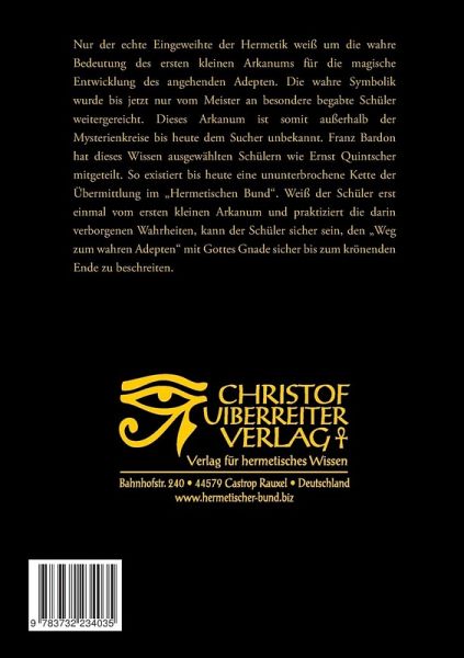 Nur der echte Eingeweihte der Hermetik weiß um die wahre Bedeutung des ersten kleinen Arkanums für die magische Entwicklung des angehenden Adepten. Die wahre Symbolik wurde bis jetzt nur vom Meister an besondere begabte Schüler weitergereicht. Dieses Arkanum ist somit außerhalb der Mysterienkreise bis heute dem Sucher unbekannt. Franz Bardon hat dieses Wissen ausgewählten Schülern wie Ernst Quintscher mitgeteilt. So existiert bis heute eine ununterbrochene Kette der Übermittlung im "Hermetischen Bund". Weiß der Schüler erst einmal vom ersten kleinen Arkanum und praktiziert die darin verborgenen Wahrheiten, kann der Schüler sicher sein, den "Weg zum wahren Adepten" mit Gottes Gnade sicher bis zum krönenden Ende zu beschreiten.Inhaltsangabe:Bemerkung zum 1. kleinem Arkanum von AnionVorwort:1. Die Tarot-Karten in der Hermetik2. Die vier hermetischen Karten3. Der Seelenspiegel4. Der göttliche Spiegel5. Drei Kreise6. Die göttlichen Eigenschaften7. Meditation8. Richtiges Verhalten9. Auftretende Probleme10. Das Ergebnis der Gottverbundenheit11. ZusammenfassungNachwort: