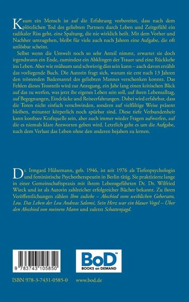 Die Erfahrung, dass nach dem plötzlichen Tod des geliebten Partners durch Leben und Zeitgefühl ein radikaler Riss geht, eine Spaltung, die nie wieder wirklich heilt, trifft kaum einen Menschen vorbereitet. Mit dem Vorher und Nachher, mit der für immer entstandenen Leerstelle umzugehen, bleibt für viele auch nach Jahren eine Aufgabe, die oft unlösbar scheint. Wenn Schmerz und Trauer sich wie etwas alltägliches eingenistet haben und Bewegungen stattfinden, die äußerlich betrachtet wie wirkliches Leben aussehen, können innere Prozesse ablaufen, die in einer eigenen, ganz anderen Sprache von einer schwer zu fassenden Realität erzählen.Die noch so sehr Anteil nehmende Umwelt erwartet irgendwann ein Ende, zumindest ein Abklingen der Trauer und eine Rückkehr ins Leben. Wie mühsam und schwierig diese sein kann - auch davon erzählt das vorliegende Buch.Die Autorin fragt sich, warum sie erst 13 Jahren später den Bademantel des geliebten Mannes loslassen und verschenken konnte, obwohl ihr vorher Dinge nie besonders wichtig waren. Der Verlust dieses Trostteils wird zur Anregung, über den Zeitraum von einem Jahr einen kritischen Blick auf das zu werfen, was jetzt ihr eigenes Leben sein soll. Sie beschreibt den Lebensalltag, Begegnungen, Eindrücke und Reiseerfahrungen. Dabei wird erfahrbar - vor allem in den Träumen, in denen der Tote immer noch lebt, während sie selbst mitunter tot ist -, dass die Toten nicht einfach verschwinden. Sie sind auf vielfältige Weise präsent, ihre energievollen Lebensspuren mitunter sogar im Körper spürbar. Die tiefe Verbundenheit mit ihnen kann kostbare Kraftquelle sein, gleichzeitig aber auch ein Knäuel von Rätselfragen, auf die es niemals klare Antworten geben wird. Letztlich geht es um die Aufgabe, nach dem Verlust das Leben ohne den anderen bejahen zu lernen.