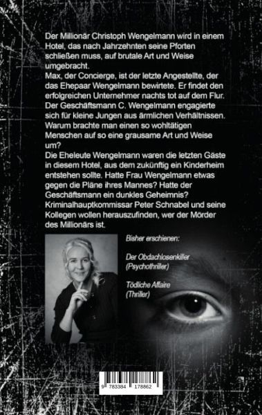 Der Millionär Christoph Wengelmann wird in einem Hotel, das nach Jahrzehnten seine Pforten schließen muss, auf brutale Art und Weise umgebracht. Max, der Concierge, ist der letzte Angestellte, der das Ehepaar Wengelmann bewirtete. Er findet den erfolgreichen Unternehmer nachts tot auf dem Flur.Der Geschäftsmann C. Wengelmann engagierte sich für kleine Jungen aus ärmlichen Verhältnissen. Warum brachte man einen so wohltätigen Menschen auf so eine grausame Art und Weise um?Die Eheleute Wengelmann waren die letzten Gäste in diesem Hotel, aus dem zukünftig ein Kinderheim entstehen sollte. Hatte Frau Wengelmann etwas gegen die Pläne ihres Mannes? Hatte der Geschäftsmann ein dunkles Geheimnis? Kriminalhauptkommissar Peter Schnabel und seine Kollegen wollen herauszufinden, wer der Mörder des Millionärs ist.