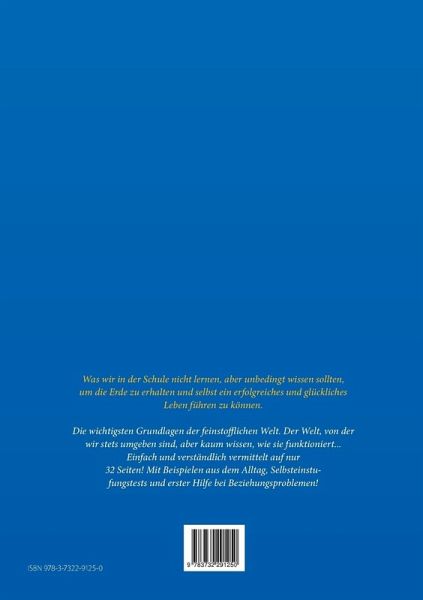 Was wir in der Schule nicht lernen, aber unbedingt wissen sollten, um die Erde zu erhalten und selbst ein erfolgreiches und glückliches Leben führen zu können.Die wichtigsten Grundlagen der feinstofflichen Welt. Der Welt, von der wir stets umgeben sind, aber kaum wissen, wie sie funktioniert...Einfach und verständlich vermittelt auf nur 32 Seiten! Mit Beispielen aus dem Alltag, Selbsteinstufungstests und erster Hilfe bei Beziehungsproblemen.