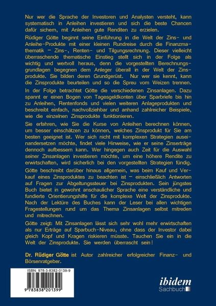 Nur wer die Sprache der Investoren und Analysten versteht, kann systematisch in Anleihen investieren und sich die beste Chancen dafür sichern, mit Anleihen gute Renditen zu erzielen. Rüdiger Götte beginnt seine Einführung in die Welt der Zins- und Anleihe-Produkte mit einer kleinen Rundreise durch die Finanzmathematik - Zins-, Renten- und Tilgungsrechnung. Dieser vielleicht überraschende thematische Einstieg stellt sich in der Folge als wichtig und wertvoll heraus, denn die vorgestellten Berechnungsgrundlagen begegnen dem Anleger überall in der Welt der Zinsprodukte. Sie bilden deren Grundgerüst. Nur wer sie kennt, kann die Zinsprodukte beurteilen und so die Spreu vom Weizen trennen. In der Folge betrachtet Götte die verschiedenen Zinsanlagen. Dazu spannt er einen Bogen von Tagesgeldkonten über Sparbriefe bis hin zu Anleihen, Rentenfonds und vielen weiteren Anlageprodukten und beschreibt einfach, nachvollziehbar und anhand zahlreicher Beispiele, wie die einzelnen Zinsprodukte funktionieren. Sie erfahren, wie Sie die Kurse von Anleihen berechnen können, um besser einschätzen zu können, welches Zinsprodukt für Sie am besten geeignet ist. Wer sich nicht mit komplexen Strategien auseinandersetzen möchte, findet viele Hinweise, wie er seine Zinserträge dennoch aufbessern kann. Wer hingegen auch Zeit für die Auswahl seiner Zinsanlagen investieren möchte, um eine höhere Rendite zu erwirtschaften, wird sicherlich bei den vorgestellten Strategien fündig. Götte beschreibt darüber hinaus allgemein, was beim Kauf und Verkauf eines Zinsproduktes zu beachten ist - einschließlich Antworten auf Fragen zur Abgeltungssteuer bei Zinsprodukten. Sein jüngstes Buch bietet in gewohnt anschaulicher Sprache eine verständliche und fundierte Orientierungshilfe für die komplexe Welt der Zinsprodukte. Nach der Lektüre des Buches kann der Leser bei allen wichtigen Fragestellungen rund um das Thema Zinsanlagen selbst mitreden und mitrechnen. Götte zeigt: Mit Zinsanlagen lässt sich sehr wohl mehr erwirtschaften als nur Erträge auf Sparbuch-Niveau, ohne dass der Investor dabei gleich Kopf und Kragen riskieren müsste. Tauchen Sie ein in die Welt der Zinsprodukte. Sie werden überrascht sein!