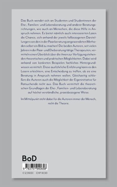 Das Buch wendet sich an Studenten und Studentinnen der Ehe-, Familien- und Lebensberatung und anderer Beratungsrichtungen, wie auch an Menschen, die diese Hilfe in Anspruch nehmen. Es bietet nämlich auch interessierten Laien die Chance, sich anhand der jeweils fallbezogenen Darstellungen von den in der Paarberatung angewendeten Methoden selbst ein Bild zu machen! Die beiden Autoren, seit vielen Jahren in der Paar- und Eheberatung tätige Therapeuten, vermitteln einen Überblick über die ihnen zur Verfügung stehenden theoretischen und praktischen Möglichkeiten. Dabei wird anhand von konkreten Beispielen fachliches Hintergrundwissen vermittelt. Diese ausführliche Einführung kann es den Lesern erleichtern, eine Entscheidung zu treffen, ob sie eine Beratung in Anspruch nehmen wollen. Gleichzeitig schließen die Autoren auch die Möglichkeit der Eigeninitiative für Ratsuchende nicht aus. Das Buch vermittelt die theoretischen Grundlagen der Ehe-, Familien- und Lebensberatung auf höchst verständliche, praxisbezogene Weise. Im Mittelpunkt steht dabei für die Autoren immer der Mensch, nicht die Theorie.