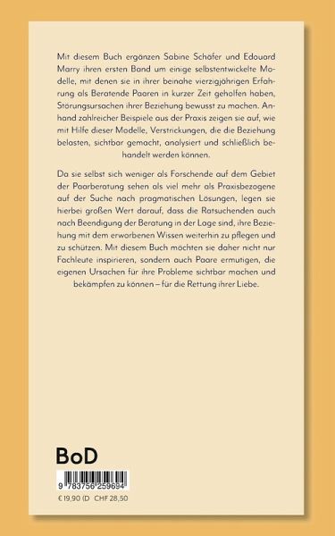 Mit diesem Buch ergänzen Sabine Schäfer und Edouard Marry ihren ersten Band um einige selbstentwickelte Modelle, mit denen sie in ihrer beinahe vierzigjährigen Erfahrung als Beratende Paaren in kurzer Zeit geholfen haben, Störungsursachen ihrer Beziehung bewusst zu machen. Anhand zahlreicher Beispiele aus der Praxis zeigen sie auf, wie mit Hilfe dieser Modelle, Verstrickungen, die die Beziehung belasten, sichtbar gemacht, analysiert und schließlich behandelt werden können.Da sie selbst sich weniger als Forschende auf dem Gebiet der Paarberatung sehen als viel mehr als Praxisbezogene auf der Suche nach pragmatischen Lösungen, legen sie hierbei großen Wert darauf, dass die Ratsuchenden auch nach Beendigung der Beratung in der Lage sind, ihre Beziehung mit dem erworbenen Wissen weiterhin zu pflegen und zu schützen. Mit diesem Buch möchten sie daher nicht nur Fachleute inspirieren, sondern auch Paare ermutigen, die eigenen Ursachen für ihre Probleme sichtbar machen und bekämpfen zu können - für die Rettung ihrer Liebe.