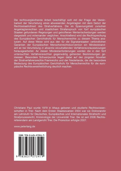 Die rechtsvergleichende Arbeit beschäftigt sich mit der Frage der Vereinbarkeit der Verurteilung eines abwesenden Angeklagten mit dem Gebot der Rechtsstaatlichkeit des Strafverfahrens. Die im Spannungsfeld zwischen Angeklagtenrechten und staatlichem Strafanspruch von fünf europäischen Staaten gefundenen Regelungen und getroffenen Wertentscheidungen werden dargestellt und miteinander verglichen. Anschließend wird die Rechtsprechung des Europäischen Gerichtshofs für Menschenrechte zu diesem Thema analysiert. Auf diese Weise wird aus den für die Signatarstaaten verbindlichen Garantien der Europäischen Menschenrechtskonvention ein Mindeststandard an bei Verurteilung in absentia einzuhaltenden Verfahrensvoraussetzungen herausgearbeitet. An diesen Mindestanforderungen werden die in den fünf untersuchten Verfahrensrechten gegenwärtig geltenden Bestimmungen gemessen. Besondere Schwerpunkte liegen dabei auf den jüngsten Novellen der Strafverfahrensrechte Frankreichs und der Niederlande, die die besondere Bedeutung des Europäischen Gerichtshofs für Menschenrechte für die europäische Rechtsvereinheitlichung deutlich machen.