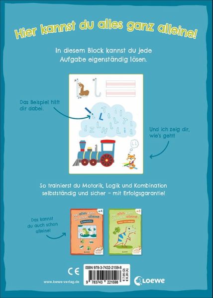 Hier kannst du alles ganz alleine! In diesem Block können Vorschulkinder jede Aufgabe eigenständig lösen. Beispiele auf den Seiten unterstützen sie bei der Bearbeitung und der kleine Fuchs zeigt ihnen, wie's geht. Ob eingekreist, durchgestrichen, verbunden, nachgespurt oder gemalt werden soll, kann seiner Pose entnommen werden. So werden Motorik, Logik und Kombination selbstständig und sicher trainiert - mit Erfolgsgarantie! Selbstständiges Rätseln ganz ohne Eltern Ohne Text - mit vielen Bildern Mit einer erfahrenen Pädagogin entwickelt Für erfolgreiches Lernen in der Vorschule Topthema Anlaute Trainiert den Umgang mit dem Stift, das logische Denken und Kombinationsgeschick Bunte Illustrationen und zielgruppengerechte Übungen Inklusive Bildanleitungen, Beispielen und Lösungen