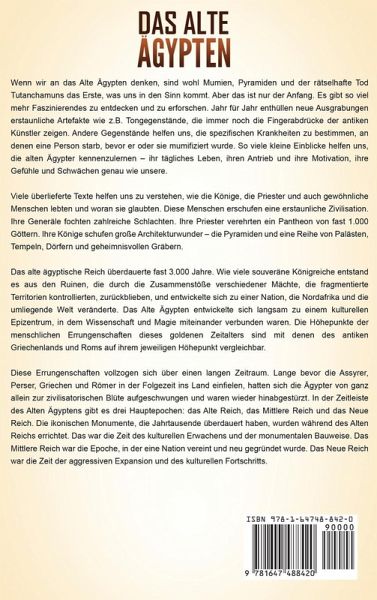 Erforschen Sie die fesselnde Geschichte des Alten Ägyptens Das Alte Ägypten ist eine der faszinierendsten und höchstentwickelten Zivilisationen der bekannten Geschichte. Man erinnert sich an die alten Ägypter wegen ihrer Götter, den Pyramiden, den Pharaonen, der Mumifizierung, der Hieroglyphen, der Landwirtschaft und vielem mehr. Dieses Buch enthüllt die Geheimnisse der fesselnden Welt des Alten Ägyptens, die faszinierenden Geschichten seiner Berühmtheiten wie Echnaton, Ramses des Großen, Königin Kleopatra und des Kindkönigs Tutanchamun. Sie werden etwas über mächtige Götter und die magische…mehr