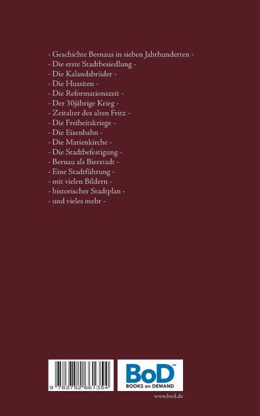 - Geschichte Bernaus in sieben Jahrhunderten - - Die erste Stadtbesiedlung - - Die Kalandsbrüder - - Die Hussiten - - Die Reformationszeit - - Der 30jährige Krieg - - Dem Zeitalter des alten Fritz - - Der Freiheitskriege -- Die Eisenbahn -- Die Marienkirche -- Die Stadtbefestigung -- Bernau als Bierstadt -- Eine Stadtführung -- und vieles mehr -- mit vielen Bildern und Darstellungen, sowie einem historischen Stadtplan -