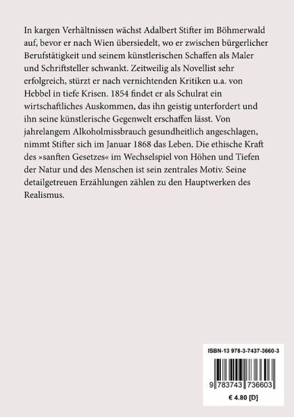 In kargen Verhältnissen wächst Adalbert Stifter im Böhmerwald auf, bevor er nach Wien übersiedelt, wo er zwischen bürgerlicher Berufstätigkeit und seinem künstlerischen Schaffen als Maler und Schriftsteller schwankt. Zeitweilig als Novellist sehr erfolgreich, stürzt er nach vernichtenden Kritiken u.a. von Hebbel in tiefe Krisen. 1854 findet er als Schulrat ein wirtschaftliches Auskommen, das ihn geistig unterfordert und ihn seine künstlerische Gegenwelt erschaffen lässt. Von jahrelangem Alkoholmissbrauch gesundheitlich angeschlagen, nimmt Stifter sich im Januar 1868 das Leben. Die ethische Kraft des "sanften Gesetzes" im Wechselspiel von Höhen und Tiefen der Natur und des Menschen ist sein zentrales Motiv. Seine detailgetreuen Erzählungen zählen zu den Hauptwerken des Realismus.