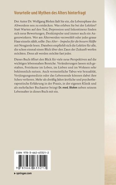 Vorurteile und Mythen des Alters hinterfragt: Der Autor Dr. Wolfgang Blohm lädt Sie ein, die Lebensphase des Altwerdens neu zu entdecken. Was erleben Sie bei der Lektüre? Statt Warten auf den Tod, Depression und Inkontinenz finden sich neue Bewertungen, Denkimpulse und immer auch ein Augenzwinkern. Wer am Älterwerden verzweifelt oder jedes graue Haar einzeln zählt, sollte "Das Alter - Impulse für die bessere Hälfte" mit Neugierde lesen. Daneben empfiehlt sich die Lektüre für alle, die schon einmal einen Blick über den Zaun der Zukunft werfen möchten. Denn alt werden möchte fast jeder.