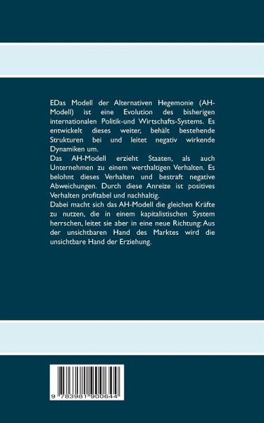 Verstehen und verändern! Ein Modell für eine bessere Welt! Das Modell der Alternativen Hegemonie (AH-Modell) ist eine Evolution des bisherigen internationalen Politik-und Wirtschafts-Systems. Es entwickelt dieses weiter, behält bestehende Strukturen bei und leitet negativ wirkende Dynamiken um. Das AH-Modell erzieht Staaten, als auch Unternehmen zu einem werthaltigen Verhalten. Es belohnt dieses Verhalten und bestraft negative Abweichungen. Durch diese Anreize ist positives Verhalten profitabel und nachhaltig. Dabei macht sich das AH-Modell die gleichen Kräfte zu nutzen, die in einem kapitalistischen System herrschen, leitet sie aber in eine neue Richtung: Aus der unsichtbaren Hand des Marktes wird die unsichtbare Hand der Erziehung.