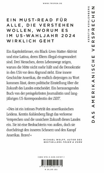 »Dies ist ein intimes Porträt des amerikanischen Leidens. Kerstin Kohlenberg fängt das verlorene Versprechen und die unsichere Zukunft dieses Landes ein. Sie ist eine Beobachterin von außen, doch sie durchdringt den inneren Schmerz und den Kampf Amerikas. Bravo!« Michael Wolff, Autor des Bestsellers Feuer & Zorn