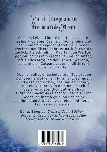 Wenn alle Träume geträumt sind, bleiben nur noch die Albträume. Caspars Leben könnte nicht besser sein! Seine Probleme lösen sich von alleine und nach einem ausgedehnten Urlaub in der Werft seiner Eltern kehrt er nach Entwerdar zurück. Als schließlich Kapitän von Werften persönlich bei ihm erscheint und ihn bittet, offizielles Mitglied der Crew zu werden, scheint sich Caspars Leben endlich zum Guten zu wenden. Doch am alles entscheidenden Tag brauen sich dunkle Wolken am Himmel zusammen, und das Seemonster, das ihm erscheint, ist nur ein Vorbote von dem neuen Leben, das er unwissentlich betreten hat. Plötzlich macht das Geschrei, das all seine Gedanken lahmlegt, Sinn und seine schlimmsten Albträume scheinen mit jedem Tag realer zu werden. Folge der Crew in ihr zweites Abenteuer voller Freundschaft, Magie und Rätsel! Bücher der Trunker Crew - Reihe: Band 1: Das Buch aus der Tiefe Band 2: Das Amulett aus der Tiefe