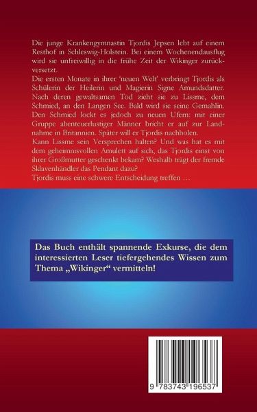 Die junge Krankengymnastin Tjordis Jepsen lebt auf einem Resthof in Schleswig-Holstein. Bei einem Wochenendausflug wird sie unversehens in die frühe Zeit der Wikinger zurückversetzt. Die ersten Monate in ihrer neuen Welt verbringt Tjordis als Schülerin der Heilerin und Magierin Signe Amundsdatter. Nach deren gewaltsamen Tod zieht sie zu Lissme, dem Schmied, an den Langen See. Bald wird sie seine Gemahlin. Den Schmied lockt es jedoch zu neuen Ufern: mit einer Gruppe abenteuerlustiger Männer bricht er auf zur Landnahme nach Britannien. Später will er Tjordis nachholen.Kann Lissme sein Versprechen halten? Und was hat es mit dem geheimnisvollen Amulett auf sich, das Tjordis einst von ihrer Großmutter geschenkt bekam? Weshalb trägt der fremde Sklavenhändler das Pendant dazu? Tjordis muss eine folgenschwere Entscheidung treffen ...Im Anhang finden sich spannende Exkurse, die dem Leser zusätzliche Informationen rund um das Thema "Wikinger" vermitteln!
