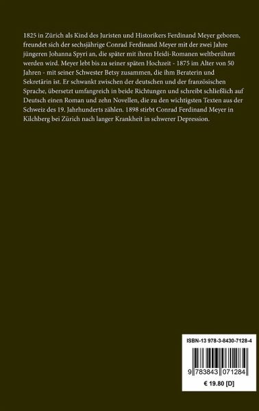 1825 in Zürich als Kind des Juristen und Historikers Ferdinand Meyer geboren, freundet sich der sechsjährige Conrad Ferdinand Meyer mit der zwei Jahre jüngeren Johanna Spyri an, die später mit ihren Heidi-Romanen weltberühmt werden wird. Meyer lebt bis zu seiner späten Hochzeit - 1875 im Alter von 50 Jahren - mit seiner Schwester Betsy zusammen, die ihm Beraterin und Sekretärin ist. Er schwankt zwischen der deutschen und der französischen Sprache, übersetzt umfangreich in beide Richtungen und schreibt schließlich auf Deutsch einen Roman und zehn Novellen, die zu den wichtigsten Texten aus der Schweiz des 19. Jahrhunderts zählen. 1898 stirbt Conrad Ferdinand Meyer in Kilchberg bei Zürich nach langer Krankheit in schwerer Depression.