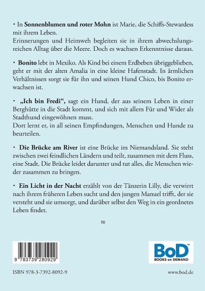 · In Sonnenblumen und roter Mohn ist Marie, die Schiffs-Stewardess mit ihrem Leben.Erinnerungen und Heimweh begleiten sie in ihrem abwechslungsreichen Alltag über die Meere. Doch es wachsen Erkenntnisse daraus.· Bonito lebt in Mexiko. Als Kind bei einem Erdbeben übriggeblieben, geht er mit der alten Amalia in eine kleine Hafenstadt. In ärmlichen Verhältnissen sorgt sie für ihn und seinen Hund Chico, bis Bonito erwachsen ist.· "Ich bin Fredi", sagt ein Hund, der aus seinem Leben in einer Berghütte in die Stadt kommt, und sich mit allem Für und Wider als Stadthund eingewöhnen muss.Dort lernt er, in all seinen Empfindungen, Menschen und Hunde zu beurteilen.· Die Brücke am River ist eine Brücke im Niemandsland. Sie steht zwischen zwei feindlichen Ländern und teilt, zusammen mit dem Fluss, eine Stadt. Die Brücke leidet darunter und tut alles, die Menschen wieder zusammen zu bringen.· Ein Licht in der Nacht erzählt von der Tänzerin Lilly, die verwirrt nach ihrem früheren Leben sucht und den jungen Manuel trifft, der sie versteht und sie umsorgt, und darüber selbst den Weg in ein geordnetes Leben findet.