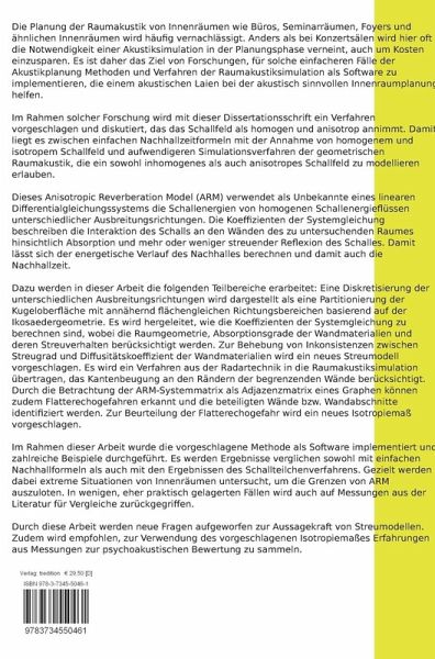 Die Planung der Raumakustik von Innenräumen wie Büros, Seminarräumen, Foyers und ähnlichen Innenräumen wird häufig vernachlässigt. Anders als bei Konzertsälen wird hier oft die Notwendigkeit einer Akustiksimulation in der Planungsphase verneint, auch um Kosten einzusparen. Es ist daher das Ziel von Forschungen, für solche einfacheren Fälle der Akustikplanung Methoden und Verfahren der Raumakustiksimulation als Software zu implementieren, die einem akustischen Laien bei der akustisch sinnvollen Innenraumplanung helfen.Im Rahmen solcher Forschung wird mit dieser Dissertationsschrift ein Verfahren vorgeschlagen und diskutiert, das das Schallfeld als homogen und anisotrop annimmt. Damit liegt es zwischen einfachen Nachhallzeitformeln mit der Annahme von homogenem und isotropem Schallfeld und aufwendigeren Simulationsverfahren der geometrischen Raumakustik, die ein sowohl inhomogenes als auch anisotropes Schallfeld zu modellieren erlauben.Dieses Anisotropic Reverberation Model (ARM) verwendet als Unbekannte eines linearen Differentialgleichungssystems die Schallenergien von homogenen Schallenergieflüssen unterschiedlicher Ausbreitungsrichtungen. Die Koeffizienten der Systemgleichung beschreiben die Interaktion des Schalls an den Wänden des zu untersuchenden Raumes hinsichtlich Absorption und mehr oder weniger streuender Reflexion des Schalles. Damit lässt sich der energetische Verlauf des Nachhalles berechnen und damit auch die Nachhallzeit.