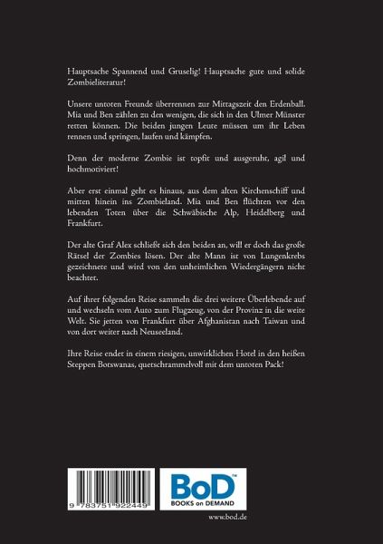 Hauptsache Spannend und Gruselig! Hauptsache gute und solide Zombieliteratur!Unsere untoten Freunde überrennen zur Mittagszeit den Erdenball. Mia und Ben zählen zu den wenigen, die sich in den Ulmer Münster retten können. Die beiden jungen Leute müssen um ihr Leben rennen und springen, laufen und kämpfen. Denn der moderne Zombie ist topfit und ausgeruht, agil und hochmotiviert!Aber erst einmal geht es hinaus, aus dem alten Kirchenschiff und mitten hinein ins Zombieland. Mia und Ben flüchten vor den lebenden Toten über die Schwäbische Alp, Heidelberg und Frankfurt.Der alte Graf Alex schließt sich den beiden an, will er doch das große Rätsel der Zombies lösen. Der alte Mann ist von Lungenkrebs gezeichnete und wird von den unheimlichen Wiedergängern nicht beachtet. Auf ihrer folgenden Reise sammeln die drei weitere Überlebende auf und wechseln vom Auto zum Flugzeug, von der Provinz in die weite Welt. Sie jetten von Frankfurt über Afghanistan nach Taiwan und von dort weiter nach Neuseeland. Ihre Reise endet in einem riesigen, unwirklichen Hotel in den heißen Steppen Botswanas, quetschrammelvoll mit dem untoten Pack!