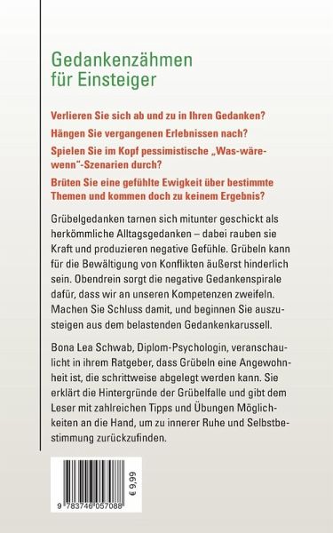 "Raus aus der Grübelfalle"Verlieren Sie sich ab und zu in Ihren Gedanken? Hängen Sie vergangenen Erlebnissen nach? Spielen Sie im Kopf pessimistische "Was-wäre-wenn"-Szenarien durch? Brüten Sie eine gefühlte Ewigkeit über bestimmte Themen und kommen doch zu keinem Ergebnis?Grübelgedanken tarnen sich mitunter geschickt als herkömmliche Alltagsgedanken - dabei rauben sie Kraft und produzieren negative Gefühle. Grübeln kann für die Bewältigung von Konflikten äußerst hinderlich sein. Obendrein sorgt die negative Gedankenspirale dafür, dass wir an unseren Kompetenzen zweifeln. Machen Sie Schluss damit, und beginnen Sie auszusteigen aus dem belastenden Gedankenkarussell.Bona Lea Schwab, Diplom-Psychologin, veranschaulicht in ihrem illustrierten Ratgeber, dass Grübeln eine Angewohnheit ist, die schrittweise abgelegt werden kann. Sie erklärt die Hintergründe der Grübelfalle und gibt dem Leser mit zahlreichen Tipps und Übungen Möglichkeiten an die Hand, um zu innerer Ruhe und Selbstbestimmung zurückzufinden.